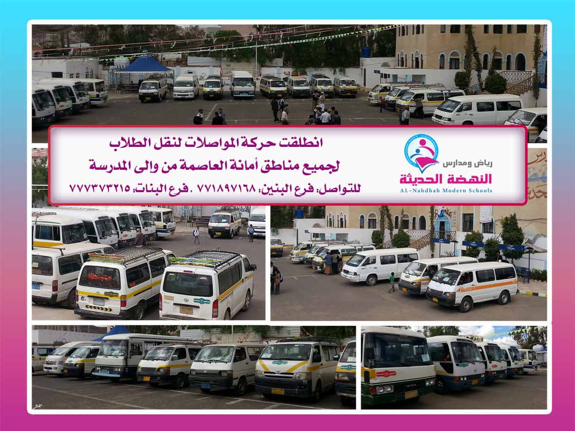 مع بداية العام الدراسي 2017/2018م وتوافد الطلاب من جميع مديريات أمانة العاصمة – صنعاء – كان لزاماً على مدارس النهضة الترتيب لحركة النقل والمواصلات لنقل الطلاب من و إلى المدرسة، بما يتواءم مع شروط الأمن والسلامة العامة.